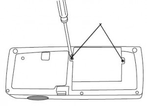 - Turn the ASK Proxima M1 projector upside down. Loosen the two screws on the lamp door.