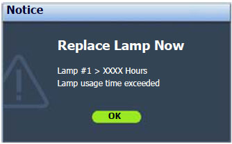 - Highlight Reset Lamp #1 Timer/Reset Lamp #2 Timer. A warning message displays asking if you want to reset the lamp timer.