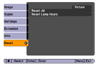 - Press the MENU button on the remote control. The Lamp Reset Menu will appear.