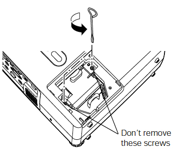 Using the screw driver provided, loosen both screws holding the Epson ELPLP30 screws in place. They will not come out of the lamp altogether.