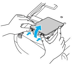 Remove the Epson V11H128020 lamp cover by putting your fingers in the latches and lifting upwards. Put the lamp cover to one side.