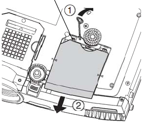 Loosen the two screw holding the Epson ELPLP22 lamp in place (they will not come all the way out). NOTE: The Epson ELPLP22 lamp contains mercury and should not be thrown into regular garbage. Recycle your used lamps!