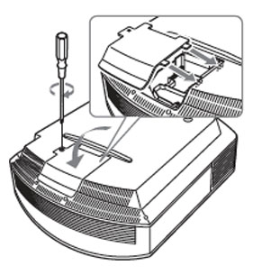 Using a Philips screwdriver, loosen the screw holding the lamp cover in place. Slide the lamps cover off the Sony VPL-HW30ES projector. Put it to one side.