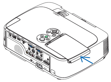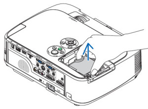 Reattach the NEC NP M361X lamp cover by sliding the cover until it snaps into place. Tighten the screw on the lamp cover.