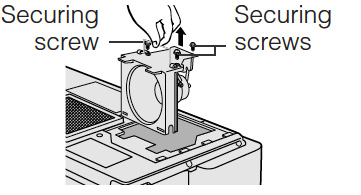Fasten the securing screws. Slide the lamp cage cover back on in the direction of the projector. Then tighten the user service screw.