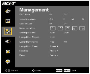 You can expect the Acer EC.J2101.001 projector lamp to last 2000 hours on Standard mode and 3000 hours on Eco mode. (You can turn Eco Mode on or off from the Management menu.) Track the lamp life for the Acer EC.J2101.001 projector lamp on the Managment menu under Lamp Hour Relapse.