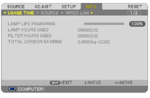 - Scroll down to USAGE TIME to display the LAMP LIFE REMAINING and LAMP HOURS USED.