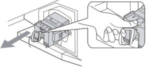 Slide it in slowly by pressing the PUSH part of the front corners of the lamp until it stops with a firm clicking sound to lock. To ensure the lamp is securely installed, press the area marked PUSH before closing the lamp cover.