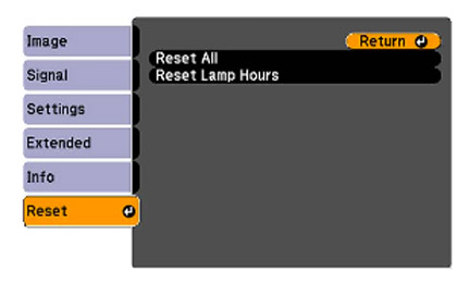- Press the MENU button on the remote control. The Lamp Reset Menu will appear.