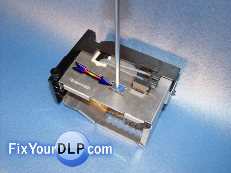 3.- El tercer tornillo se encuentra al extremo contrario de las aperturas cuadradas, destorníllelo para poder liberar la tapa de la cubierta metálica. |