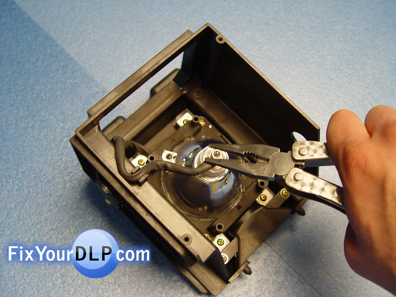 5.- Use las pinzas para retirar la tuerca en el borne superior de la lámpara. |