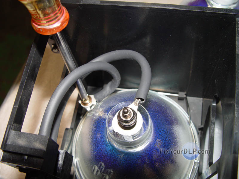 Use your pliars to remove the nut from the top terminal on the lamp. |