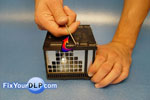 4.- Mueva 1/4 de pulgada el sujetador de la lámpara, tenga cuidado de no dañar el conector de la lámpara. |